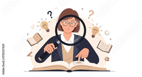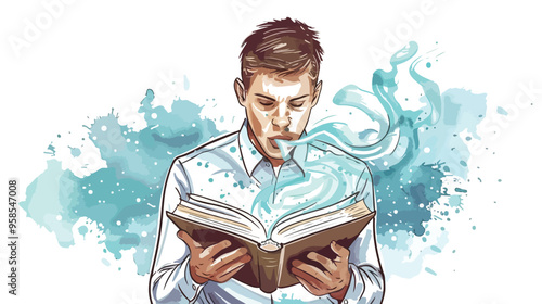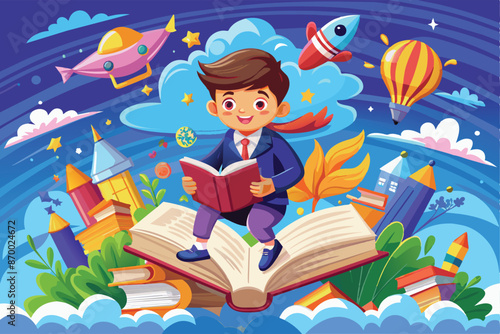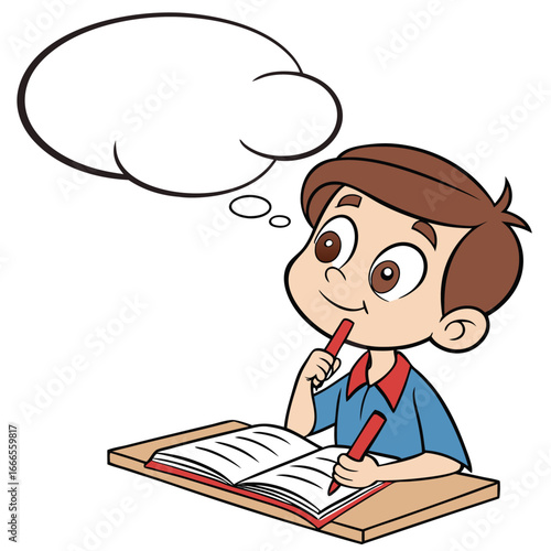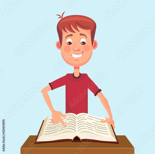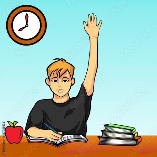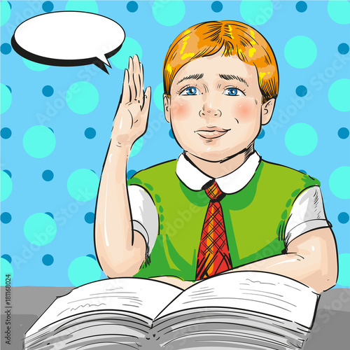 Векторная иллюстрация школьника, сидящего за столом с открытой книгой на нем. Умный ученик с поднятой рукой готов ответить на вопрос. Плакат "Назад в школу" в стиле комиксов ретро-поп-арта.
