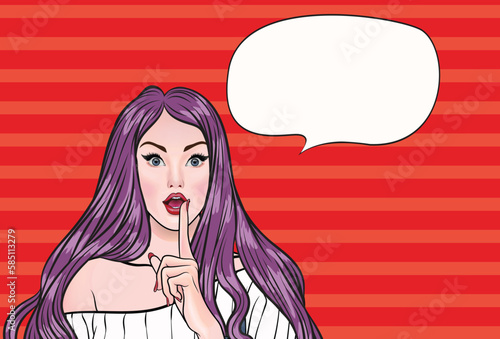 Векторная иллюстрация красивой молодой женщины с пальцем на губах. Девушка в стиле пин-ап, демонстрирующая жест молчания в стиле комиксов ретро-поп-арта.
