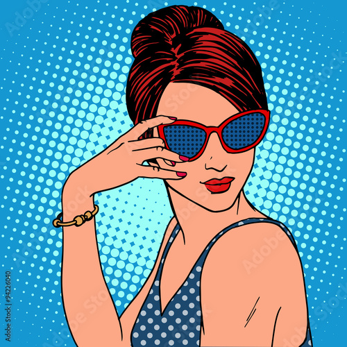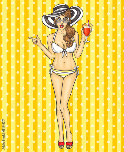 Векторная иллюстрация молодой улыбающейся женщины в купальнике, шляпе и солнцезащитных очках с бутылкой газированной воды. Красивая девушка на пляже в стиле ретро-поп-арт-комиксов.