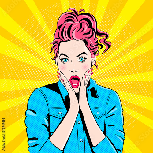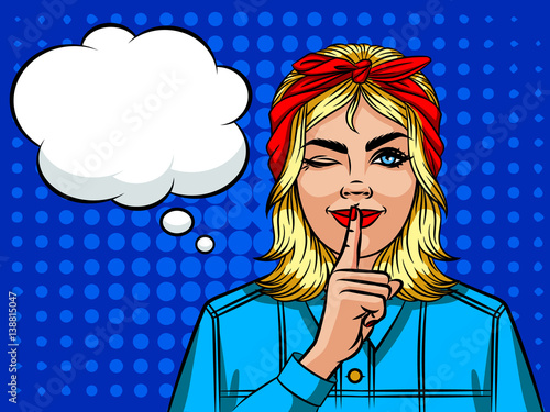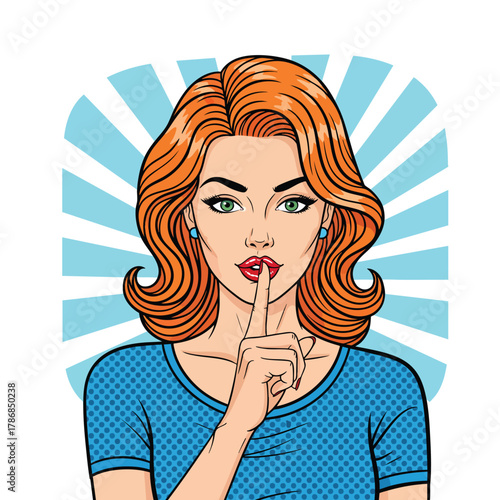 Векторная иллюстрация красивой женщины, держащей указательный палец на губах. Леди показывает жест молчания в стиле комиксов ретро-поп-арта.