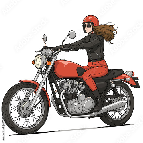 Векторная иллюстрация молодой женщины, сидящей на мотоцикле. Мотоциклист или девушка-модель в стиле комиксов ретро-поп-арта.