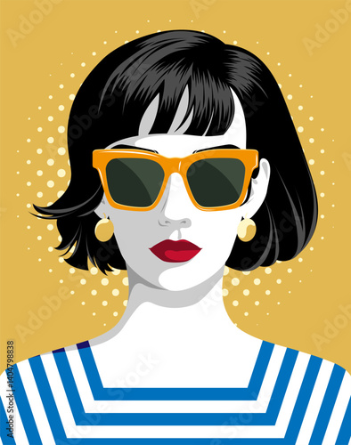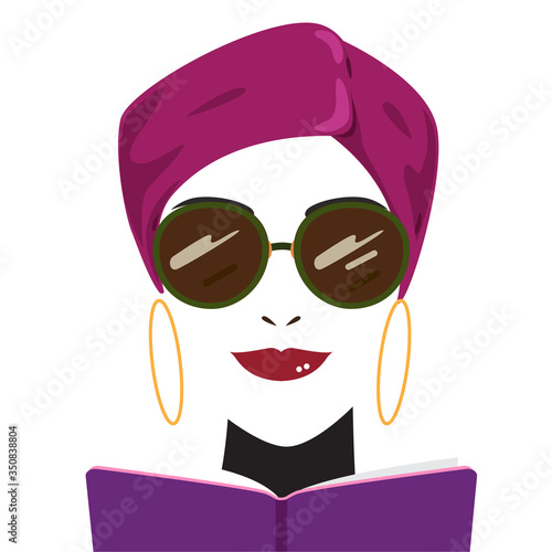 Векторная иллюстрация красивой девушки в розовых очках с процентными знаками, показывающими цифровой планшет. Концепция распродаж, скидок в стиле комиксов ретро-поп-арта.