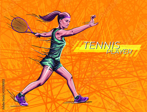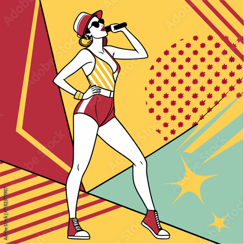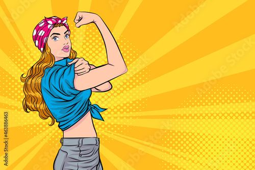 Векторная иллюстрация бегущей бизнесвумен в красной накидке. Комическая девушка в стиле ретро поп-арт в костюме супергероя, летающие бумажные деньги, речевой пузырь.