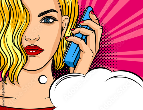 Векторная иллюстрация красивой женщины, держащей флакон духов. Приколоть блондинку в стиле ретро-поп-арт-комиксов.