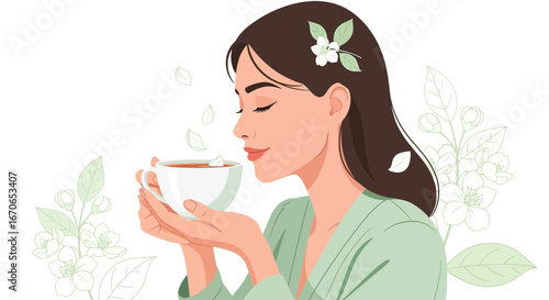 Векторная иллюстрация женщины с чашкой чая. Портрет девушки в стиле ретро-поп-арт в стиле комиксов.