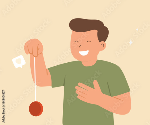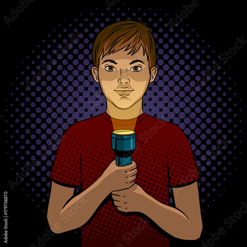 Векторная иллюстрация красивого мужчины, нажимающего большую красную кнопку в стиле комиксов ретро-поп-арта.