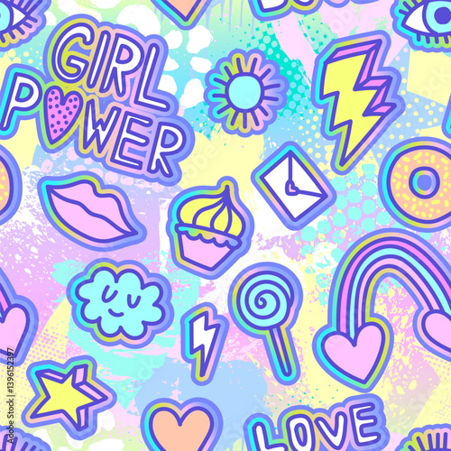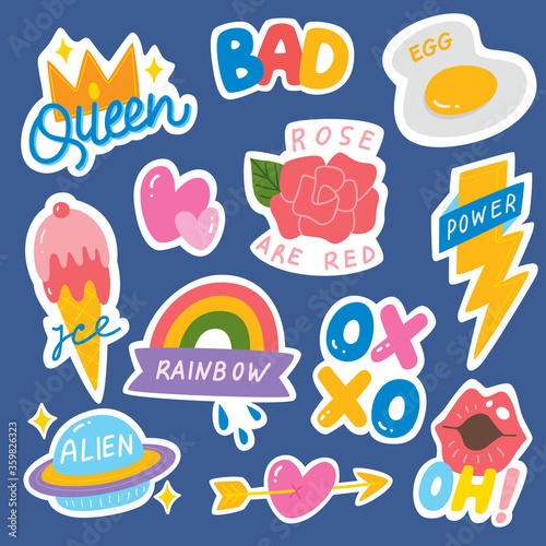 Векторный набор старинных значков комиксов поп-арта, нашивок, наклеек и речевых пузырей, модных фраз и выражений "Любовь", "Лучший", "Следуй за мной", "Поп".