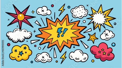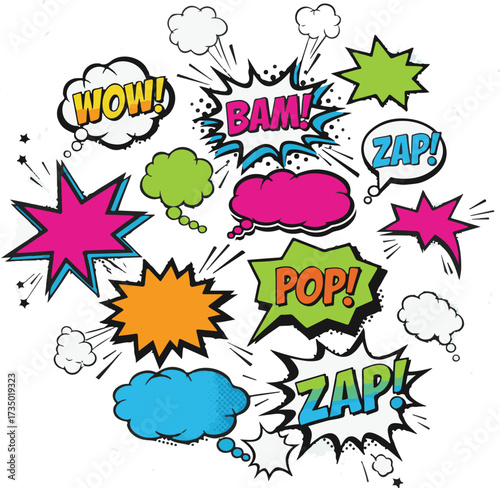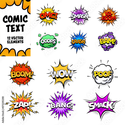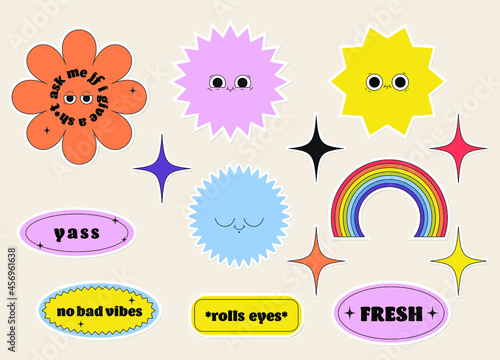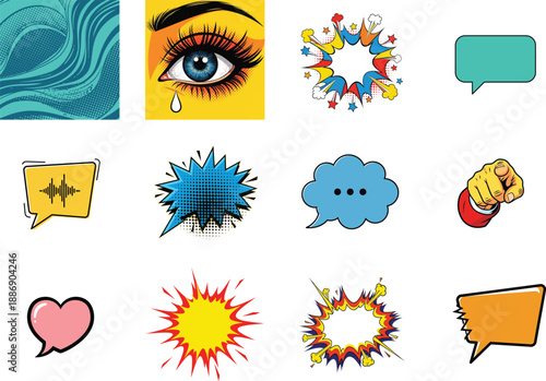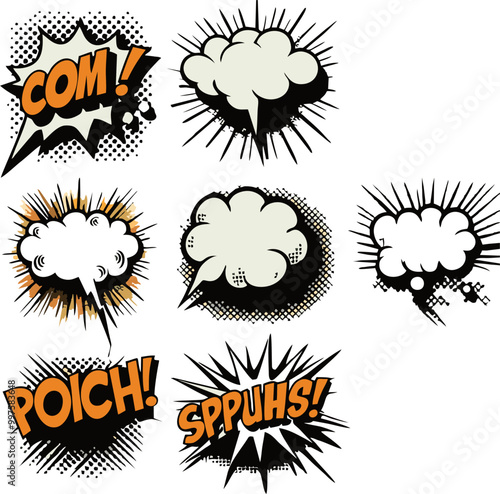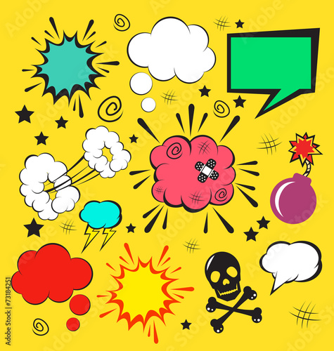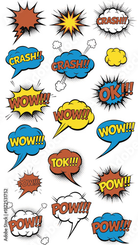 Векторный набор старинных значков комиксов в стиле поп-арт, нашивок, наклеек и речевых пузырей с модными фразами и выражениями Да, Упс, Хм.