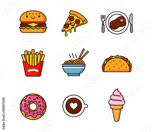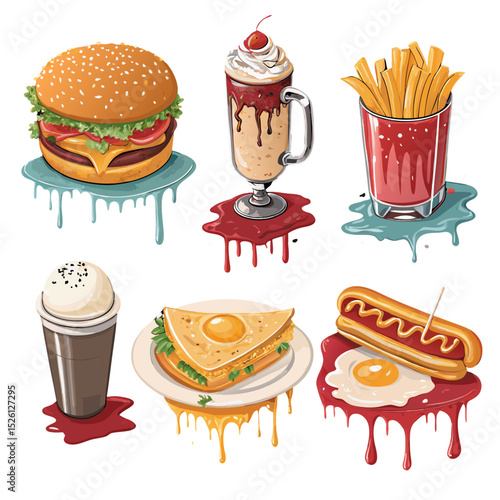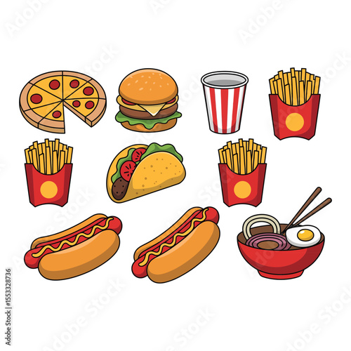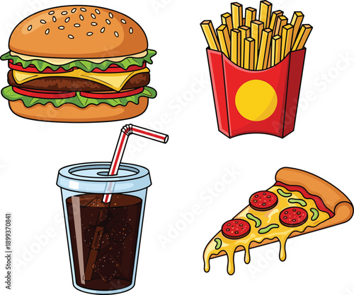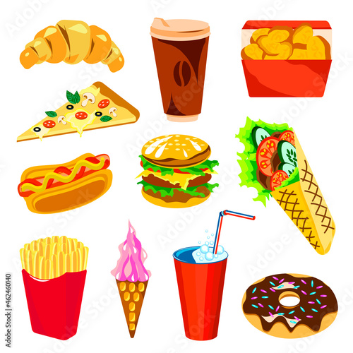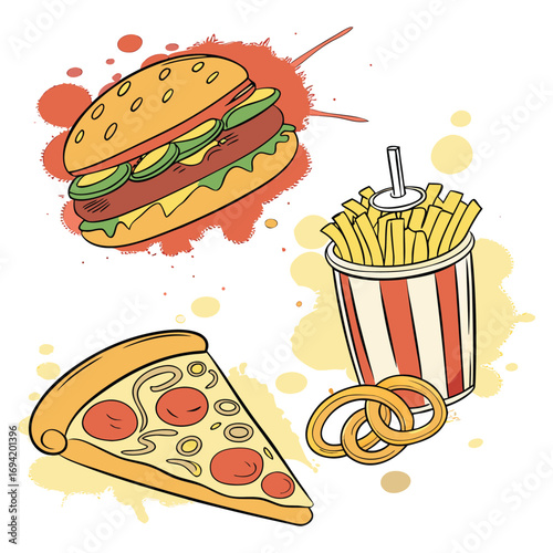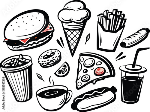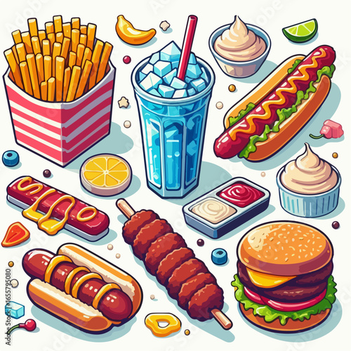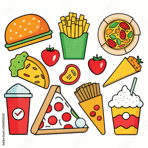 Векторный модный крутой набор нашивок для быстрого питания, значков. Рожок мороженого, пончик, картофель фри, кофе, гамбургер, пицца, попкорн, хот-дог и кола в стиле комиксов ретро-поп-арта.