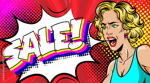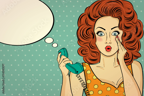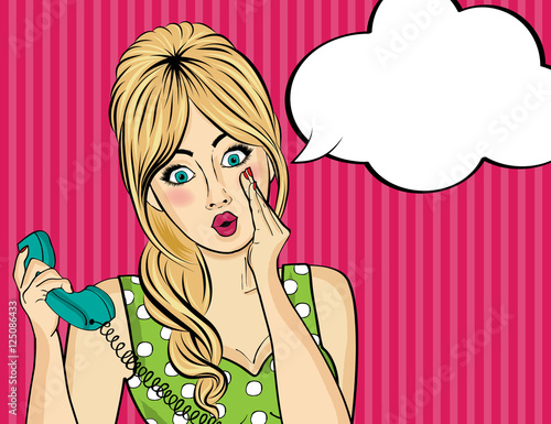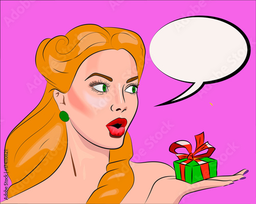 Векторная иллюстрация удивленной красивой женщины, думающей о деньгах, подумал пузырь. Портрет девушки в стиле ретро-поп-арт в стиле комиксов.