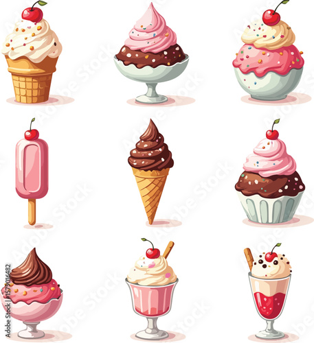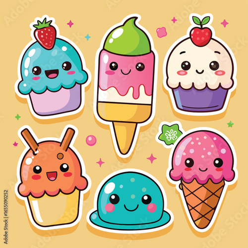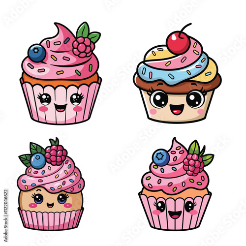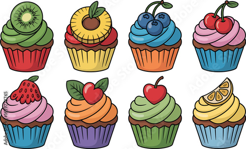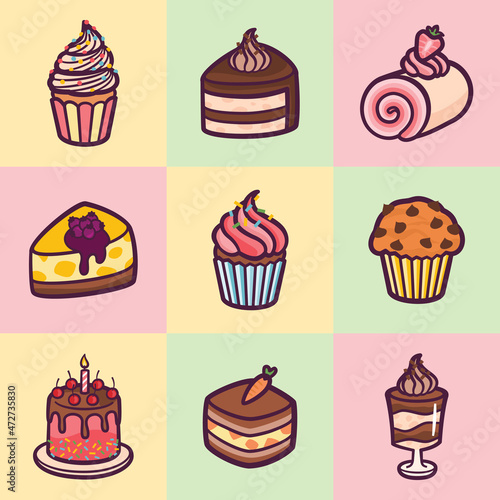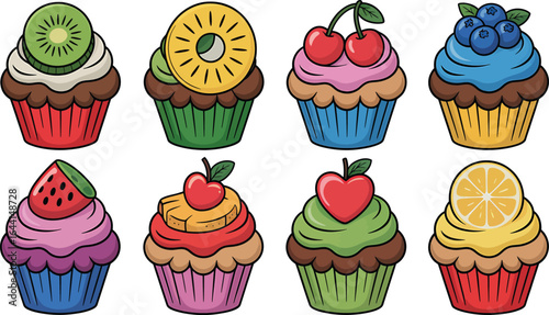 Векторный набор вкусных кексов в стиле поп-арт. Шоколад, фрукты, ванильные кексы винтажная иллюстрация в стиле эскиза. Вкусные патчи для кексов, коллекция наклеек.