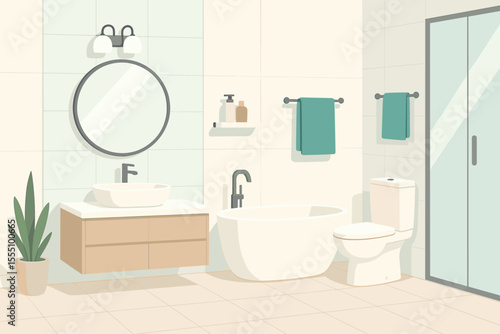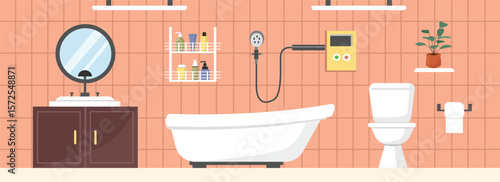 Векторный плакат с мебелью для ванной комнаты, туалетом и аксессуарами в плоском стиле.