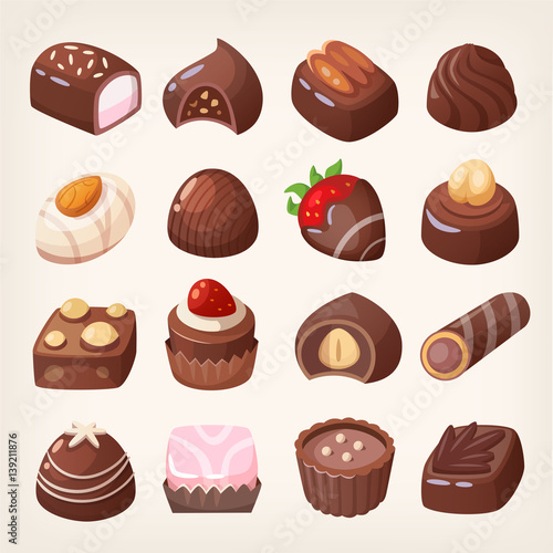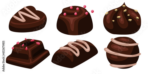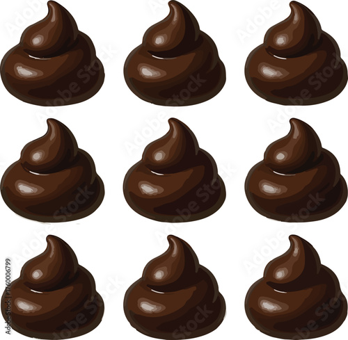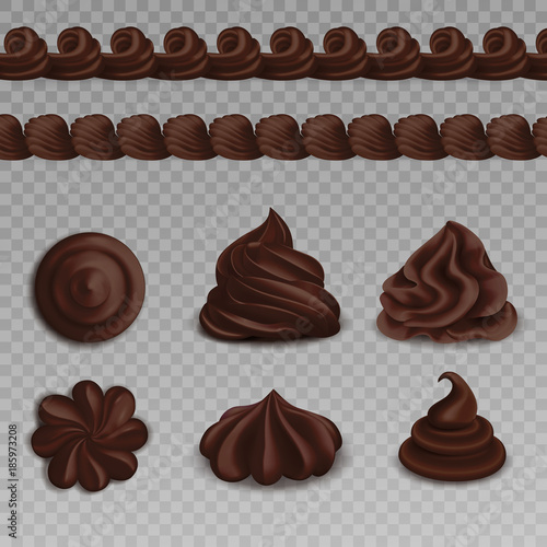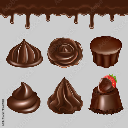 Набор векторных значков шоколадного десерта. Реалистичная иллюстрация шоколадных взбитых сливок и расплавленного шоколада.