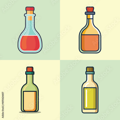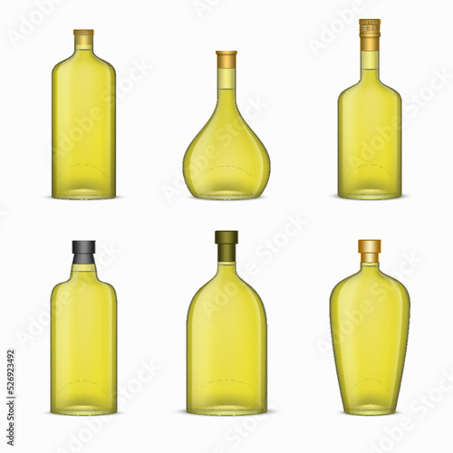 Векторный набор реалистичных стеклянных бутылок и банок с оливковым маслом, изолированных на белом фоне. Шаблоны упаковки оливкового масла. Реклама продукта с оливковым маслом.