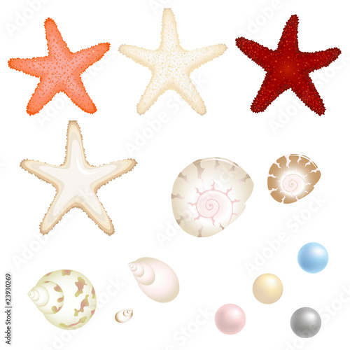 Векторный набор изолированных иконок реалистичных морских раковин и морских звезд. Красивые раковины морских моллюсков и жемчужная раковина.