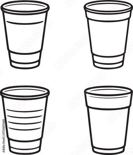 Векторный набор заполненных и пустых прозрачных одноразовых пластиковых стаканчиков. Контейнер для холодного, горячего напитка реалистичные шаблоны.