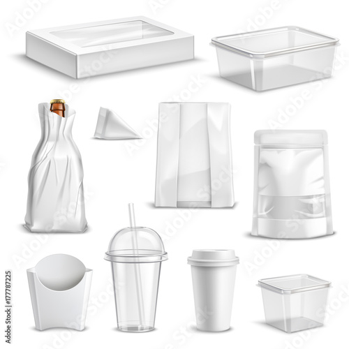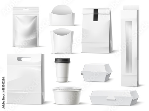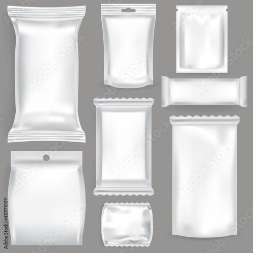 Набор макетов упаковки влажных салфеток. Векторная реалистичная белая пустая упаковочная фольга и пластиковые контейнеры с клапаном для влажных салфеток, изолированные на белом фоне.