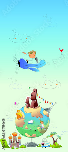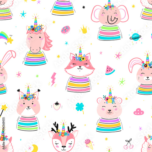 Векторный бесшовный узор с красивой принцессой, поедающей мороженое, и милым мифическим драконом, держащим торт. Фон персонажей средневековых мультфильмов, обои, ткань, оберточная бумага.