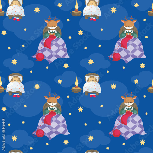 Векторный бесшовный узор с милыми животными медведем, кроликом и совой, наслаждающимися катанием на сноуборде. Зимний фон, обои, ткань, оберточная бумага.