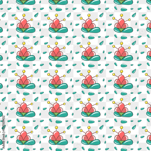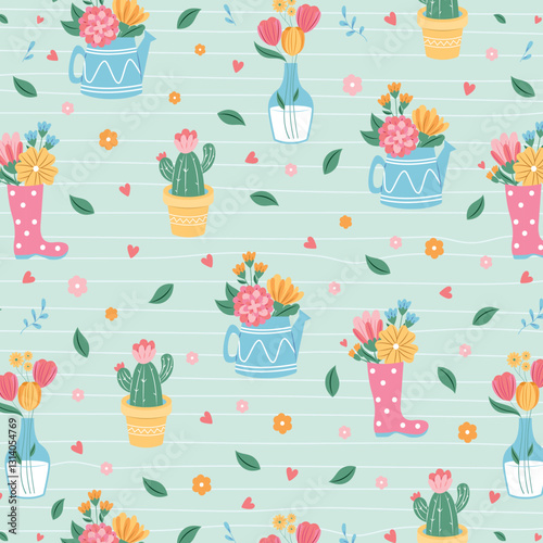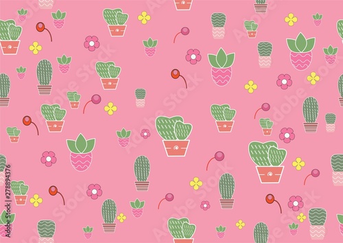 Векторный бесшовный узор с милыми сочными кавайными кактусами со смешными рожицами в горшках. Цветочный фон с кактусами, обои, ткань, оберточная бумага.
