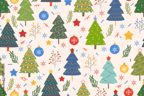 Векторный бесшовный узор с рождественскими елками, подарочными коробками и милой кошкой с повязкой из оленьих рогов на голове. Рождественские кошки фон, обои, ткань, оберточная бумага.