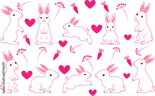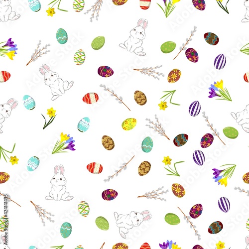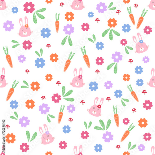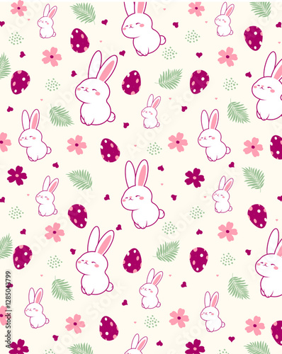 Векторный бесшовный узор с милыми пасхальными кроликами, сидящими в пасхальных яйцах и весенних цветах. Пасхальный праздничный фон, обои, ткань, оберточная бумага.