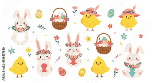 Векторный бесшовный узор с милым пасхальным ежом, медведем и совой, держащими пасхальные яйца, весенние цветы. Пасхальные животные фон, обои, ткань, оберточная бумага.