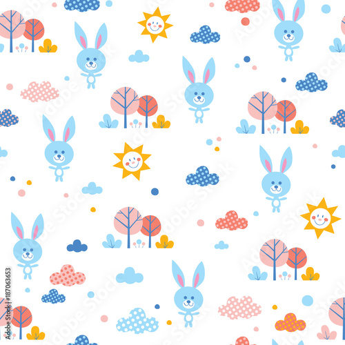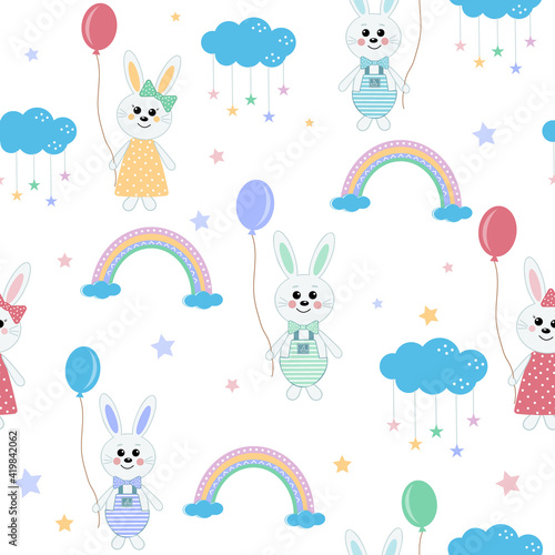 Векторный бесшовный узор с милыми пасхальными кроликами, пасхальными яйцами, весенними цветами и сердечками. Пасхальный праздничный фон, обои, ткань, оберточная бумага.