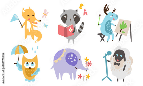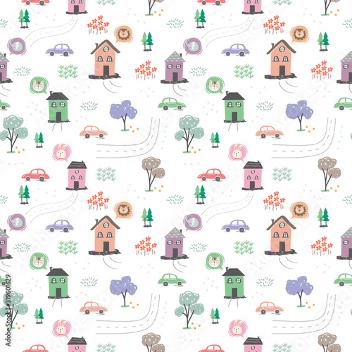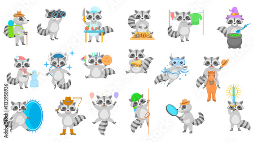 Векторный бесшовный узор с милыми енотами, держащими торт, поющими с микрофоном и наушниками и веселящимися. Забавный фон с енотом, обои, ткань, оберточная бумага.