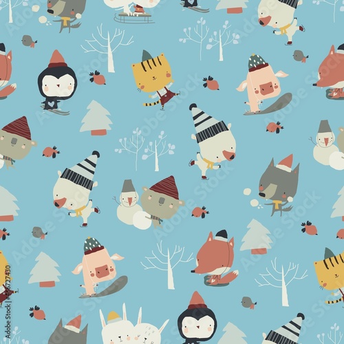 Векторный бесшовный узор с милыми енотами, отдыхающими во время питья кофе, сидящими в позе йоги и лежащими. Забавный фон с енотом, обои, ткань, оберточная бумага