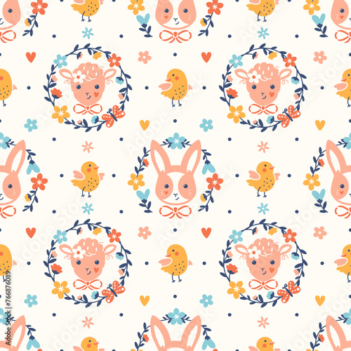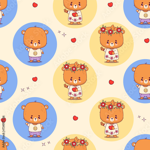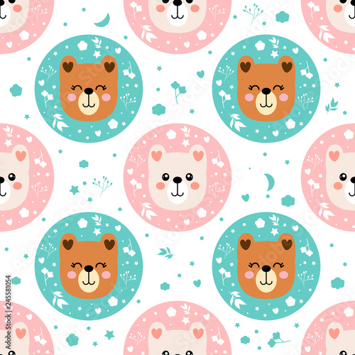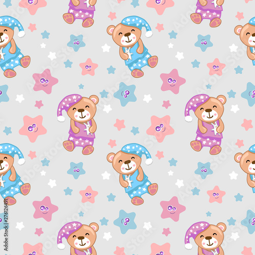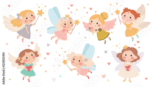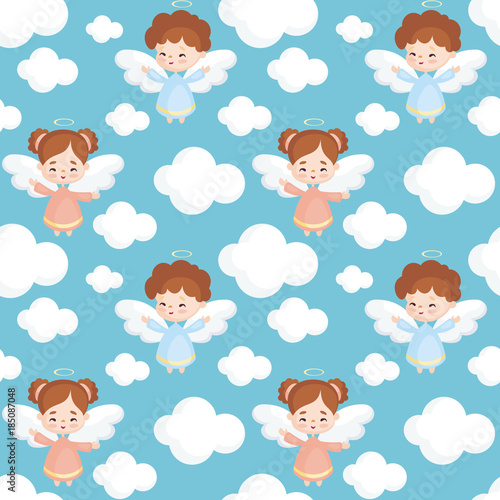 Векторный бесшовный узор с милыми маленькими девочками, мифическими существами и сказочными персонажами с крыльями, летящими в небе. Детский сказочный фон, обои, ткань, оберточная бумага.