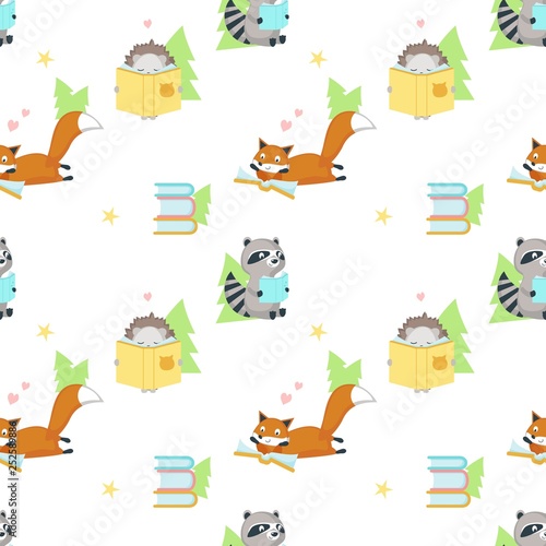 Векторный бесшовный узор с милой белкой и кроликом, читающими книги. Забавный фон для чтения животных, обои, ткань, оберточная бумага.
