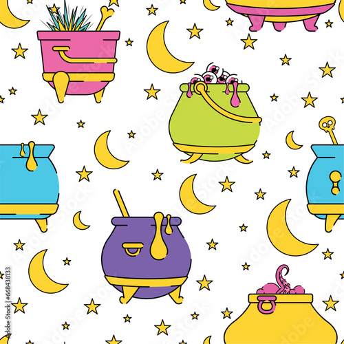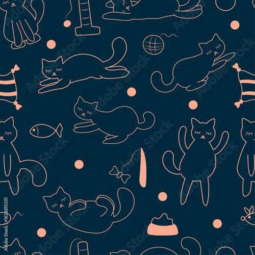 Векторный бесшовный узор с милыми спящими кошками и ночным звездным небом. Забавные спящие животные фон, обои, ткань, оберточная бумага.