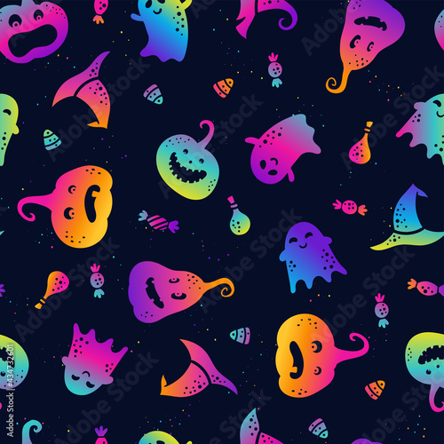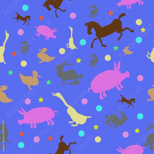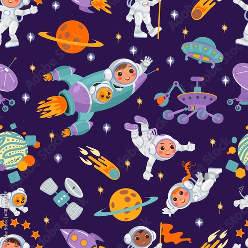 Векторный бесшовный узор с милыми спящими кошками, ночное звездное небо. Забавные спящие животные фон, обои, ткань, оберточная бумага.