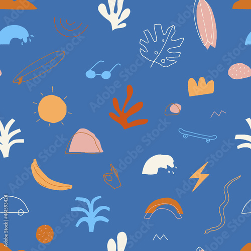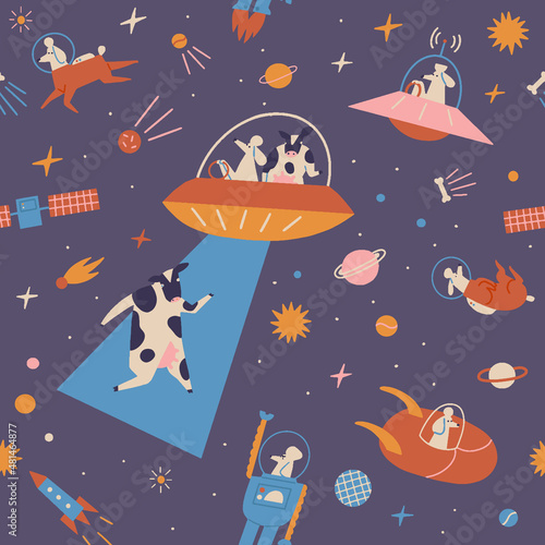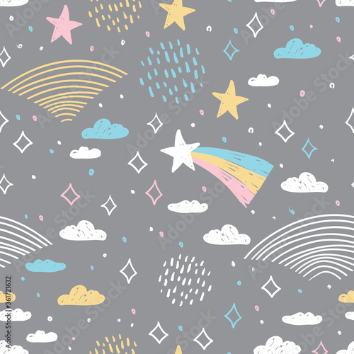 Векторный бесшовный узор с милым спящим енотом, лисой и медведем, ночное звездное небо. Забавные спящие животные фон, обои, ткань, оберточная бумага.