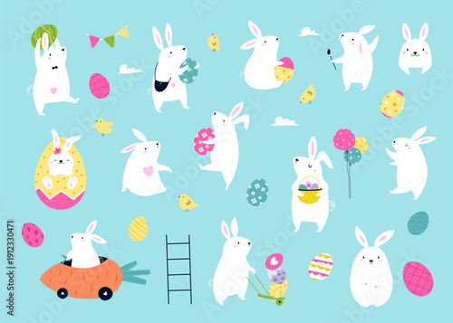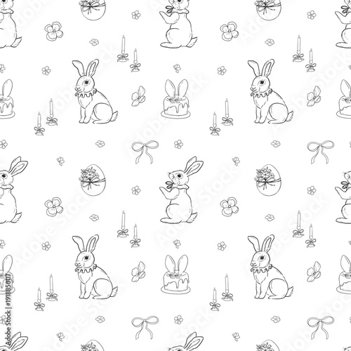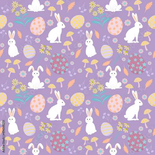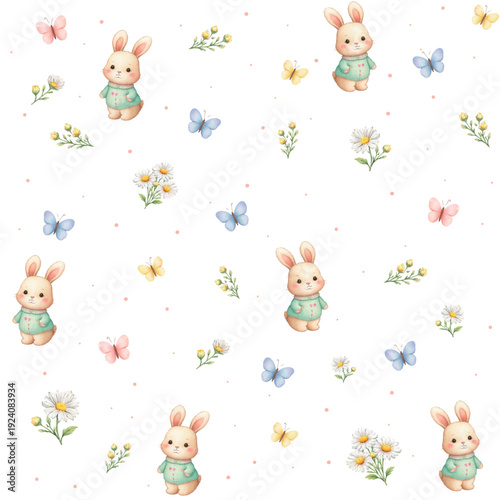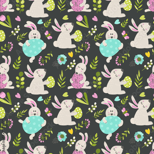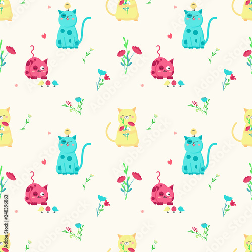 Векторный бесшовный узор с милыми мультяшными кошками с весенними цветами и птицами. Весенние кошки фон, обои, ткань, оберточная бумага.