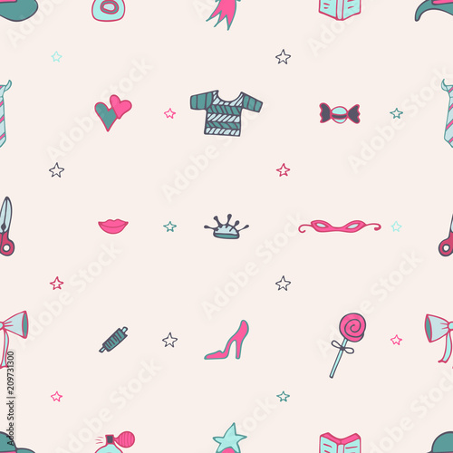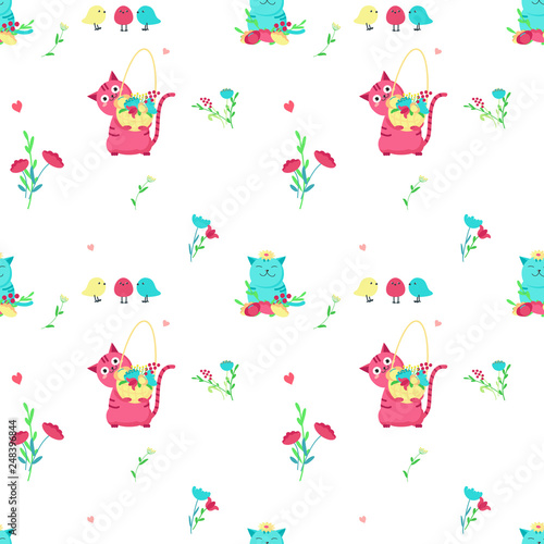 Векторный бесшовный узор с милыми кошками, весенними цветами и птицами. Забавные весенние кошки фон, обои, ткань, оберточная бумага.