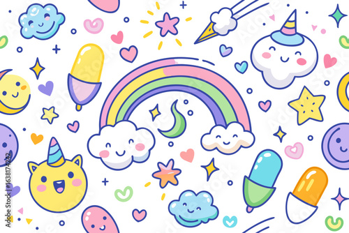 Векторный винтажный бесшовный узор с любовными значками и нашивками. Милые сердечки, губы, единорог, бриллиант, радуга, звездные модные декоративные символы.