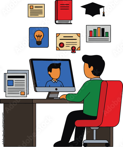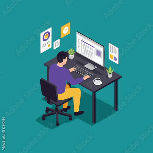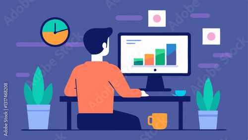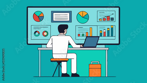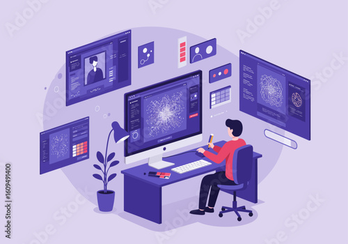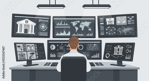 Сотрудник полиции векторной службы безопасности сидит в диспетчерской перед мониторами, отображающими видео с камер наблюдения, мультяшная иллюстрация. Концепция видеонаблюдения и компьютерной системы