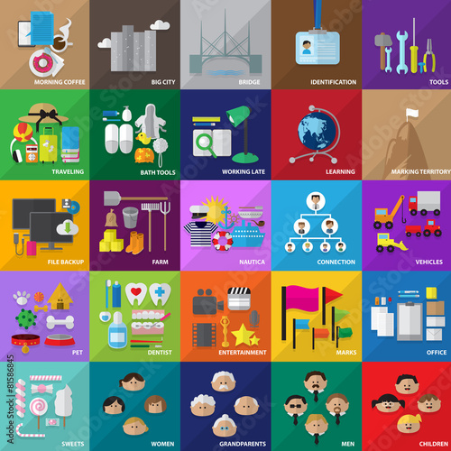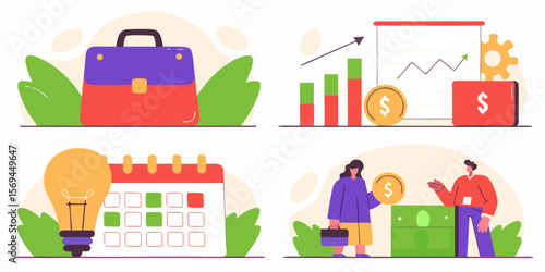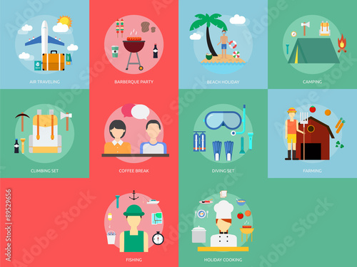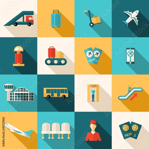 Векторный набор элементов дизайна концепции аэропорта в плоском стиле. Зал ожидания, кафе, паспортный контроль, туристы после прибытия. Путешествуйте по воздуху.