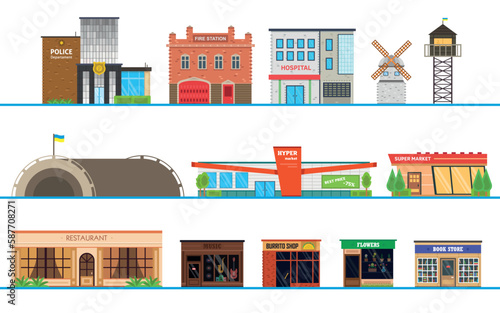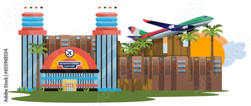 Векторный набор концептуальных плакатов интерьера аэропорта, баннеров, фонов. Терминал аэропорта, кафе, удобный зал ожидания, экстерьер, элементы дизайна такси в плоском стиле.