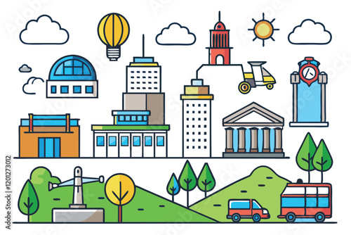 Векторный набор концептуальных плакатов парка развлечений, баннеров. Зона парка развлечений с колесом обозрения, аттракционами тира, киосками с едой, тележками и элементами дизайна для отдыха людей в плоском стиле.