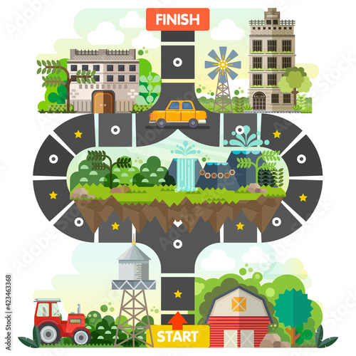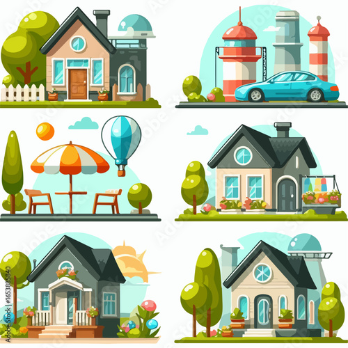 Векторный набор концептуальных плакатов парка развлечений, баннеров. Зона парка развлечений с колесом обозрения, аттракционами тира, киосками с едой, элементами дизайна тележек в плоском стиле.