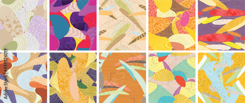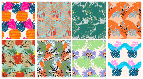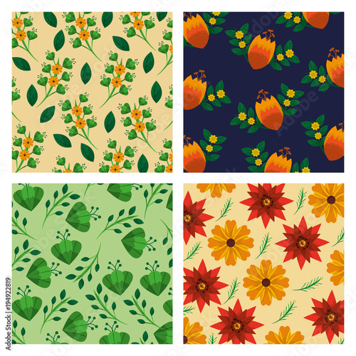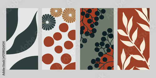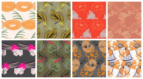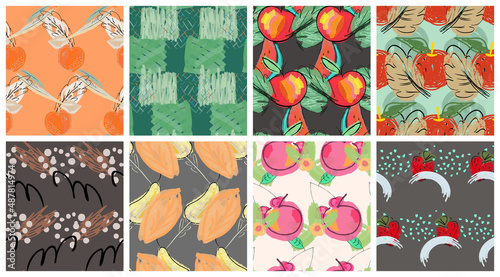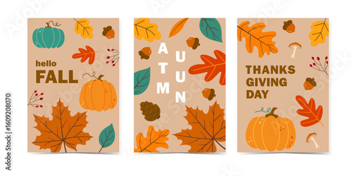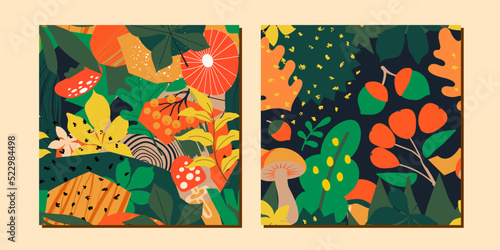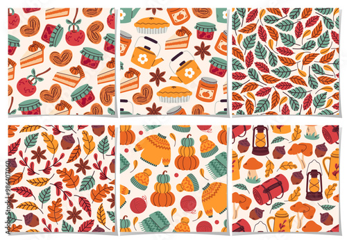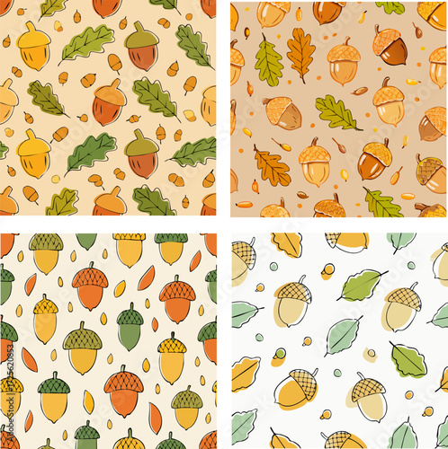 Векторный набор осенних бесшовных узоров. Иллюстрация осеннего сезона. Узор с желудями, птицей снегирем и осенними дубовыми листьями. Обои, подарочная бумага, текстильное оформление, осенние поздравительные открытки.
