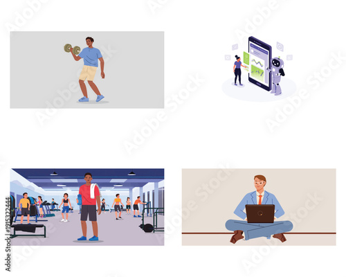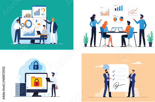 Векторный набор банковских концептуальных плакатов. Зал ожидания, коллектор, сейф и элементы дизайна очереди в плоском стиле.