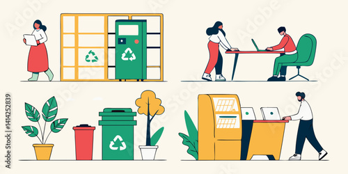 Векторный набор банковских концептуальных плакатов. Элементы дизайна банкомата, кассового ящика, системы безопасности и терминала самообслуживания в плоском стиле.