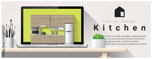 Векторный набор горизонтальных баннеров с интерьером кухни, аксессуарами и мебелью, местом для текста, плоским стилем.