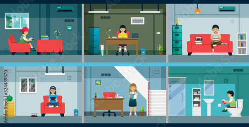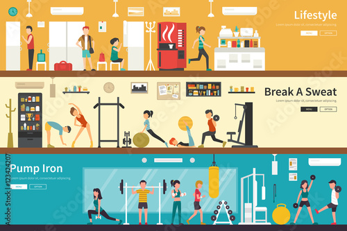 Векторный набор баннеров с интерьерами ресторанов. Люди обедают в кафе. Кухня, столовая и кафе.