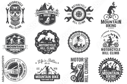 Векторный набор этикеток мастерской по ремонту велосипедов и элементов дизайна в винтажном черно-белом стиле. Велосипедный логотип, символы, эмблемы.