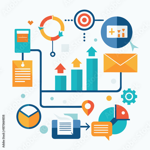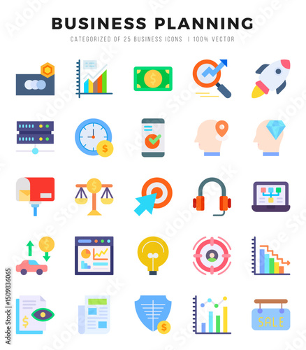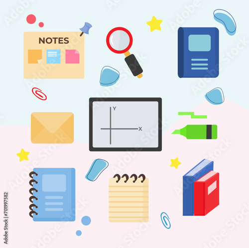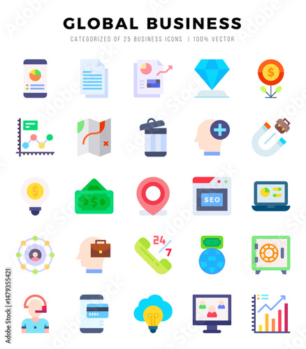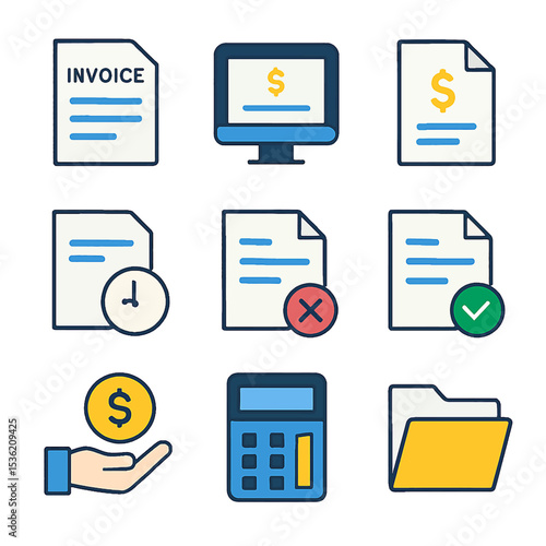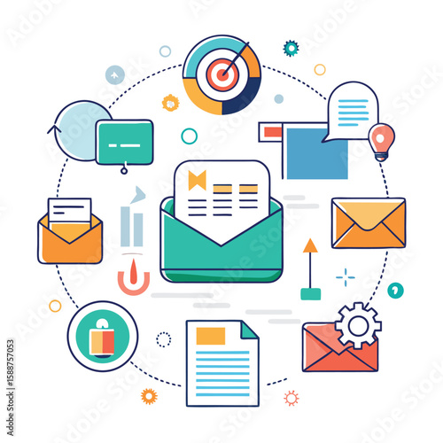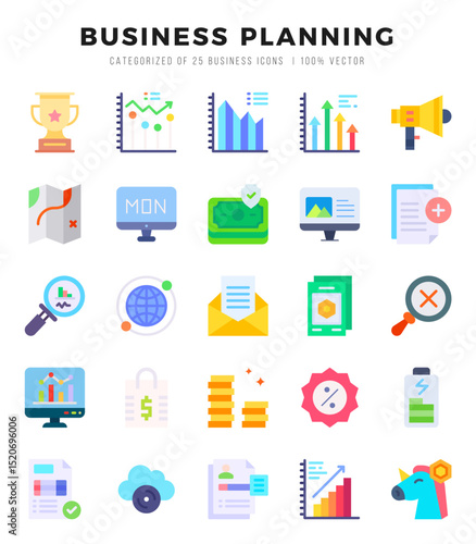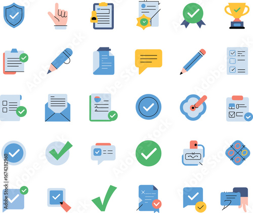 Векторный набор бизнес-иконок в стиле 3d-рендеринга. Уведомления о сообщениях, галочки, документы и контракты, электронная почта, лампочка, мобильный телефон, финансовая диаграмма. Офисные и бизнес-элементы.